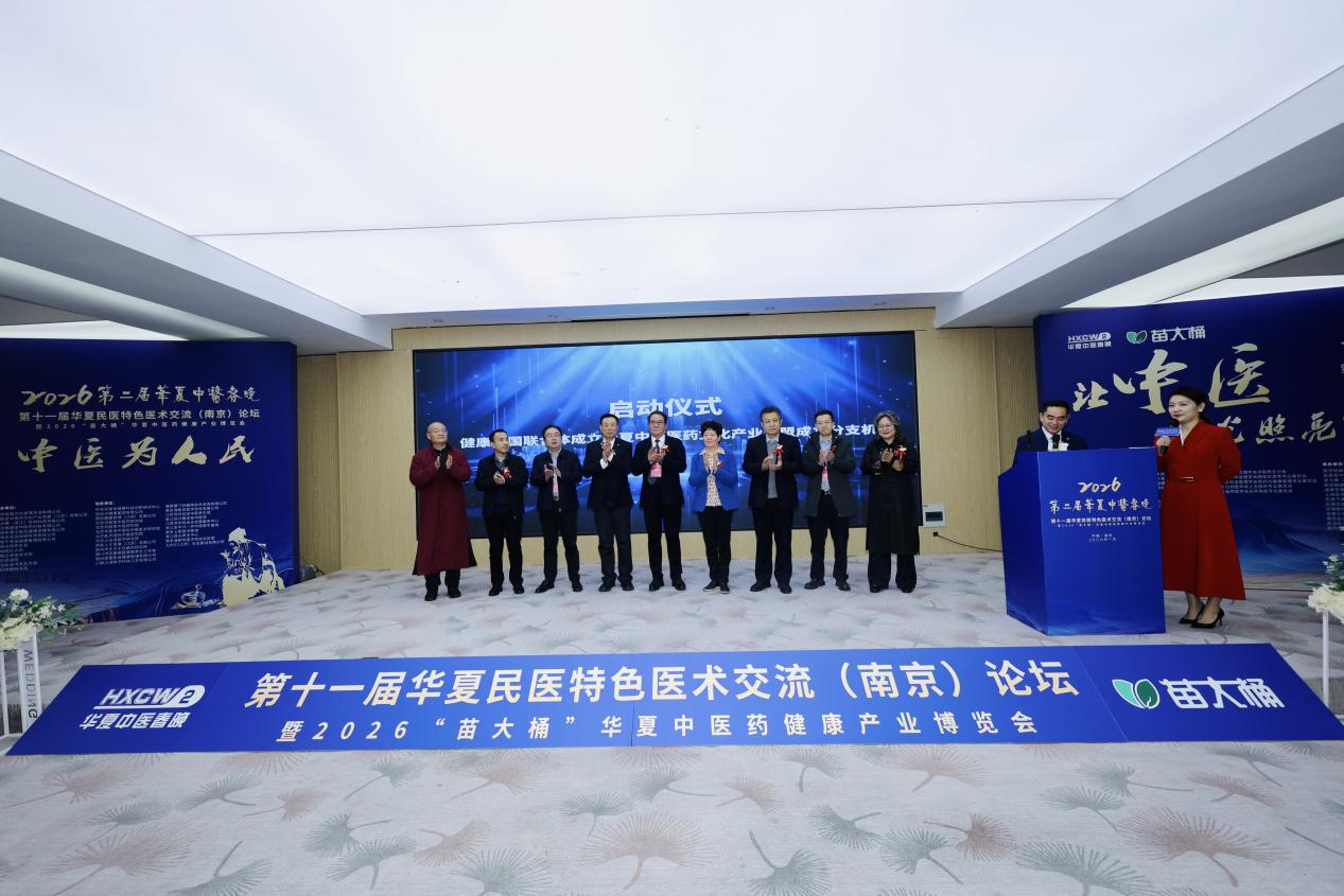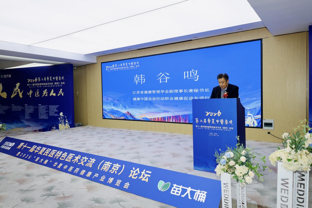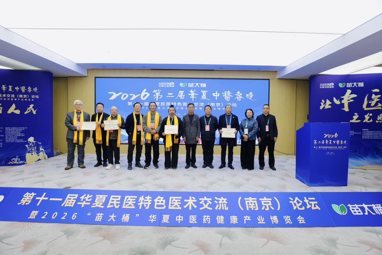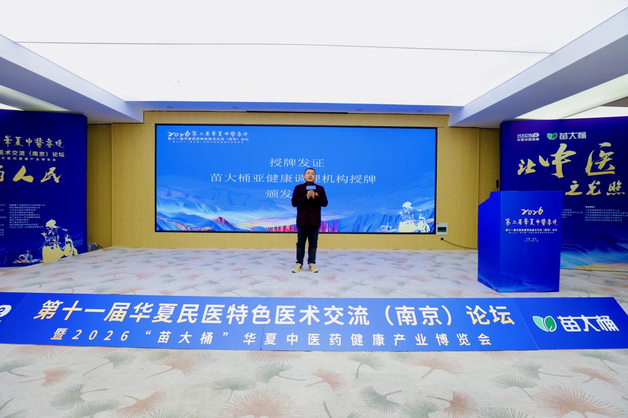 备受瞩目的第二届华夏中医春晚暨第十一届华夏民医特色医术交流(南京)论坛暨2026“苗大桶”华夏中医药健康产业博览会于近日在六朝古都南京胜利闭幕,开幕式上,江苏省健康管理学会副理事长兼秘书长韩谷鸣和世界自然医学会联合总会执行会长、南京自然医学会会长周春祥,代表主办方致辞,中国健康管理协会副会长兼秘书长周华到会发表重要讲话,原江苏省卫生厅党组书记、厅长王咏红作主旨报告,中和亚健康服务中心副主任黄博明向本次大会的冠名方、苗大桶(浙江)生物科技有限公司董事长葛伟新授牌。