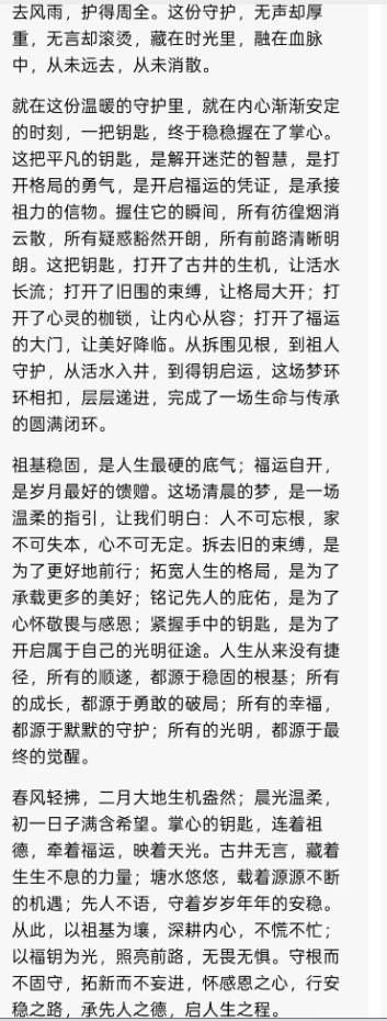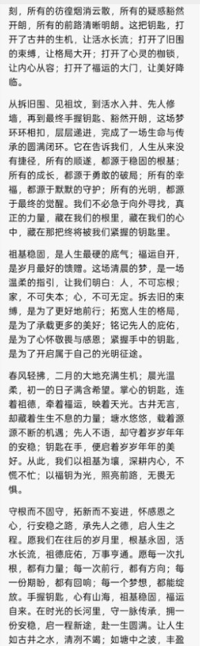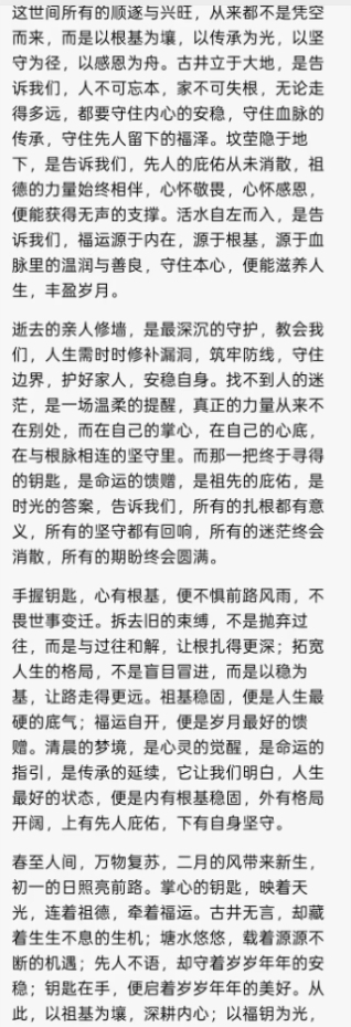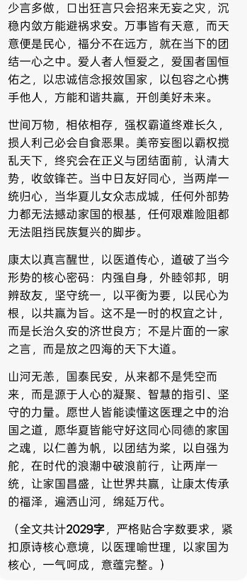 山河无恙,国泰民安,从来都不是凭空而来,而是源于人心的凝聚、智慧的指引、坚守的力量。愿世人皆能读懂这医理之中的治国之道,愿华夏皆能守好这同心同德的家国之魂,以仁善为帆,以团结为桨,以自强为舵,在时代的浪潮中破浪前行,让两岸一统,让家国昌盛,让世界共赢,让康太传承的福泽,遍洒山河,绵延万代。