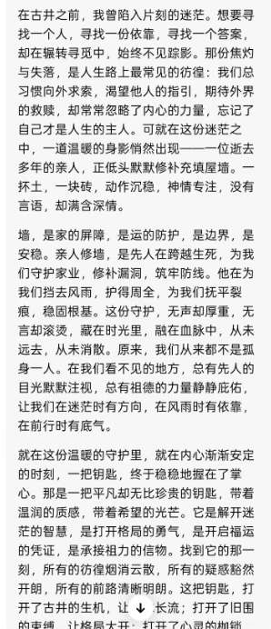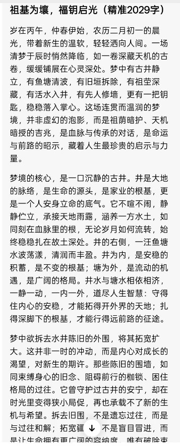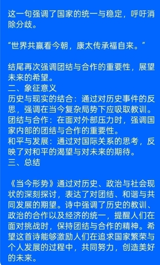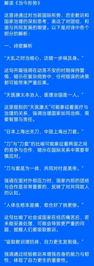 身处变局之中,言行皆需谨慎。大敌当前,少言多做,口出狂言只会招来无妄之灾,沉稳内敛方能避祸求安。万事皆有天意,而天意便是民心,福分不在远方,就在当下的团结一心之中。爱人者人恒爱之,爱国者国恒佑之,以忠诚信念报效国家,以包容之心携手他人,方能和谐共赢,开创美好未来。