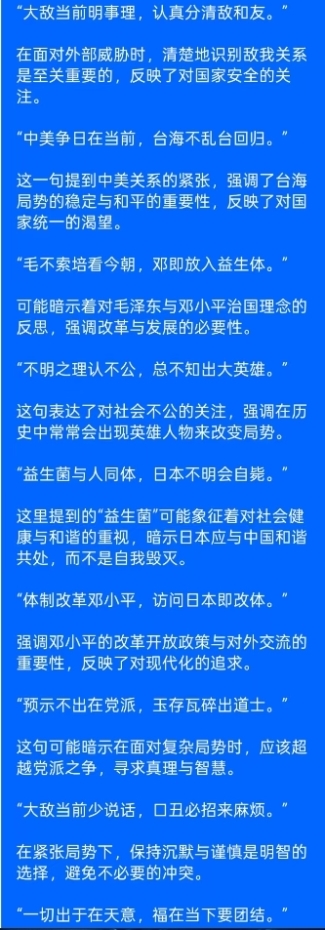 回望来路,先辈们以智慧破局,以改革兴邦。老人家先生推行体制改革,访日谋和,如同为国家注入有益的生机,让沉睡的肌体焕发活力,让封闭的格局迎来新生。这世间的真理,从不在党派纷争之中,而在民心所向、大道之行里。玉碎还是瓦全,关键在于有无坚守正道、济世安民的志士,危难之际,总会有英雄挺身而出,挽狂澜于既倒,扶大厦之将倾。