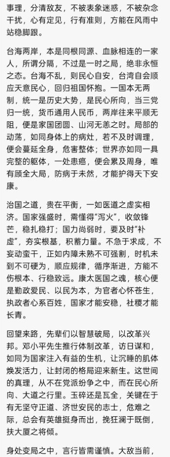 台海两岸,本是同根同源、血脉相连的一家人,所谓分隔,不过是一时之局,绝非永恒之态。台海不乱,则民心自安,台湾自会顺应天意民心,回归祖国怀抱。一国本无两制,统一是历史大势,是民心所向,当三党归一统,货币通用人民币,两岸往来平顺无阻,便是家国团圆、山河无恙之时。局部的动荡,如同身体上的病灶,若不及时调理,便会蔓延全身,危害整体;世界亦如同一具完整的躯体,一处患癌,便会累及周身,唯有顾全大局,防病于未然,才能护得天下安康。